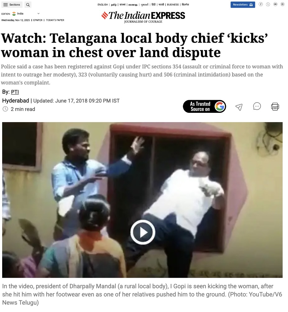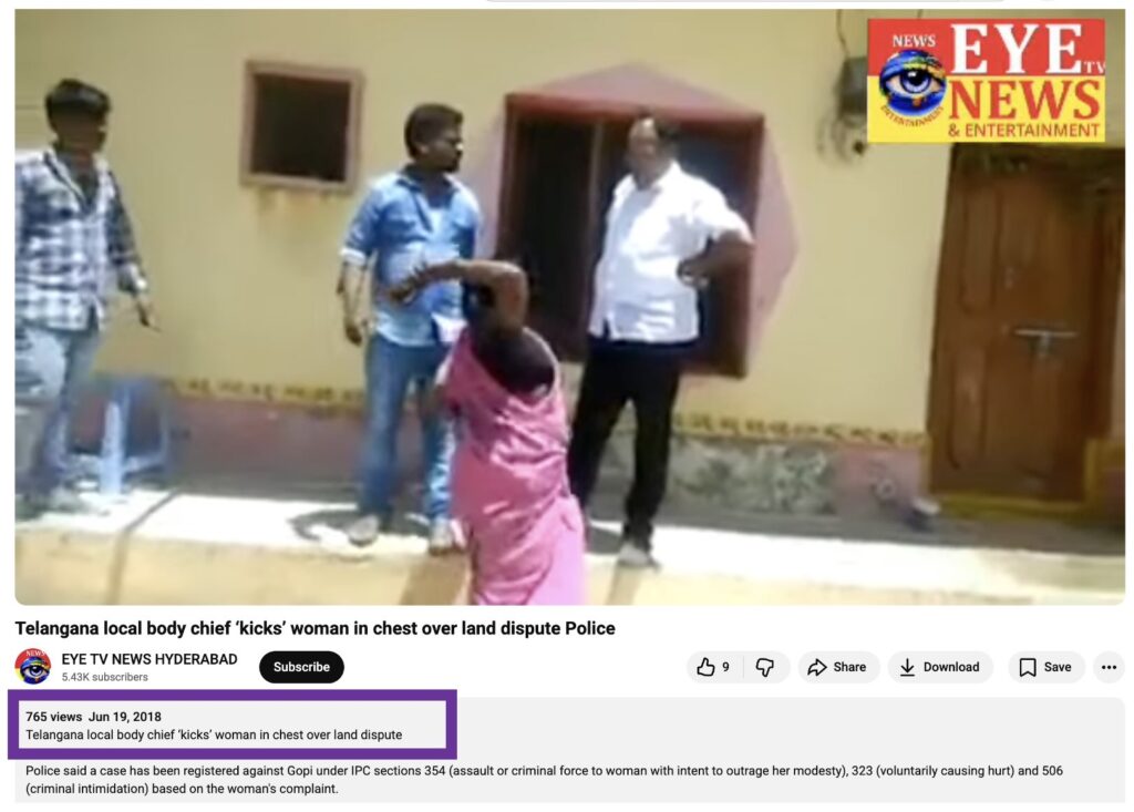 Further research led us to several media reports, including screenshots from the viral video, confirming that the incident took place in June 2018 (here, here and here). According to these reports, the video is from Nizamabad, Telangana, and shows Dharpally Mandal president and TRS leader Gopi kicking a woman during a confrontation over a land dispute. Police said the woman had earlier hit him with her footwear after Gopi allegedly refused to hand over a property she purchased for ₹33.72 lakh. A case was registered against Gopi under IPC sections 354, 323, and 506, while he filed a counter-complaint accusing the woman and her relatives of trespassing and damaging property. The dispute reportedly began after Gopi demanded an additional ₹50 lakh, citing increased land prices.
