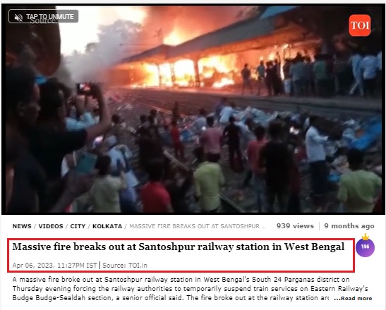 Several additional reports on this incident can be found here and here. According to a Times of India report, a massive fire broke out at Santoshpur Railway Station in West Bengal’s South 24 Parganas district on 06 April 2023 at around 5.30 pm, when the station was crowded with passengers waiting for trains. No casualties were reported, although several small shops on the platform were destroyed in the blaze. This information clearly establishes that the incident took place in West Bengal, was not recent, and dates back to April 2023.