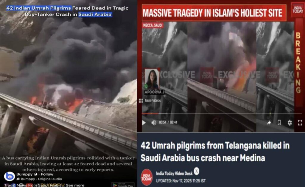 A tragic bus accident near Madinah, Saudi Arabia, on 17 November 2025, reportedly killed 45 Indian Umrah pilgrims, mostly from Telangana, after the bus collided with a diesel tanker and caught fire. Eighteen members of a single Hyderabad family were among the victims. In the aftermath, a video showing a bridge engulfed in flames began circulating on social media, with claims that it captures the scene of the Saudi Arabia accident. India Today also featured this video on 17 November 2025, presenting it as footage from the Madinah bus crash. Let’s verify the claim made in the post in this article.
