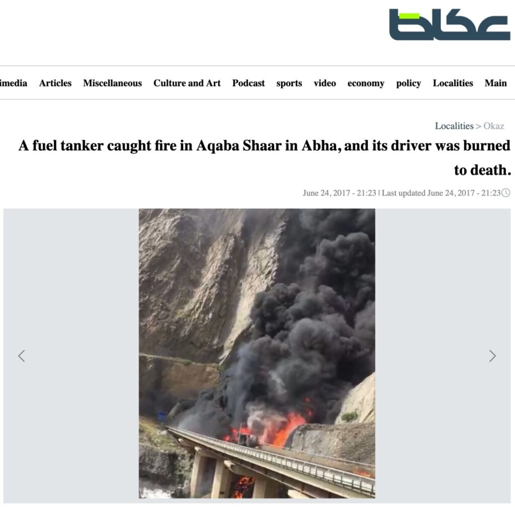 A reverse image search of keyframes from the viral video led us to multiple media reports (here, here, and here) from 2017 featuring the same visuals. According to these reports, a 32-tonne fuel tanker overturned on the Aqaba Shabar Road near the ninth tunnel on the Shaar mountain pass linking Abha, and its driver was burnt to death. This confirms that the viral video is not from the recent Saudi Arabia incident in which several Indian pilgrims were reportedly killed.