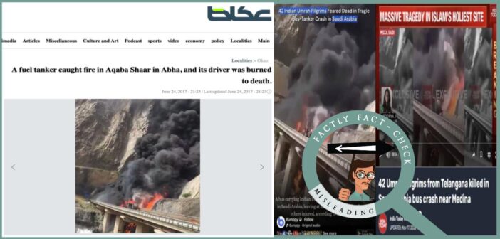 Fact: The video does not show the recent Madinah bus accident. It is from a 2017 incident in which a 32-tonne fuel tanker overturned and caught fire on the Aqaba Shabar Road near the ninth tunnel on the Shaar mountain pass linking Abha, killing the driver. Hence, the claim made in the post is MISLEADING.