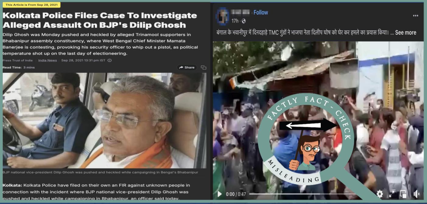 Fact: The video shows an old incident from September 2021. During an election campaign in the Bhabanipur assembly constituency, Dilip Ghosh was pushed and heckled, allegedly by the supporters of Trinamool Congress. Hence, the claim made in the post is Misleading.