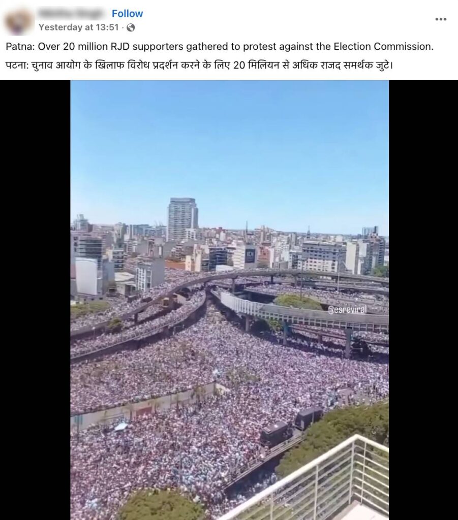 Fact: There are no credible reports of over 20 million RJD supporters gathering in Patna to protest against the Election Commission of India (ECI). The video shows celebrations in Buenos Aires, Argentina, on 20 December 2022, when millions of people gathered to welcome the World Cup–winning national football team. Hence, the claim made in the post is FALSE.
