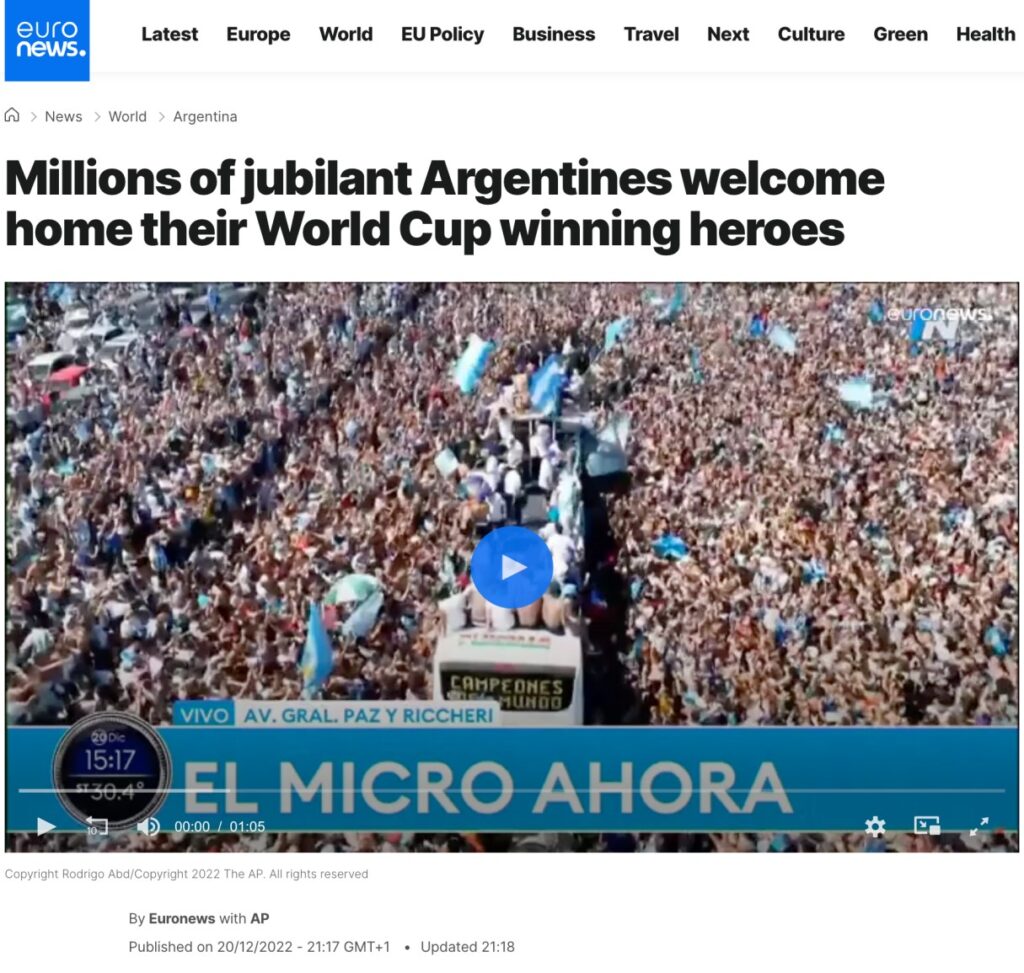 Reports (here, here, and here) from December 2022 confirm that Argentina witnessed one of its largest-ever public gatherings, as millions of fans assembled across Buenos Aires on 20 December 2022 to welcome the World Cup–winning team. Crowds filled major routes, such as the 25 de Mayo Highway, and the turnout was so overwhelming that the team’s open-top bus parade had to be halted; the players were eventually airlifted due to security concerns.
