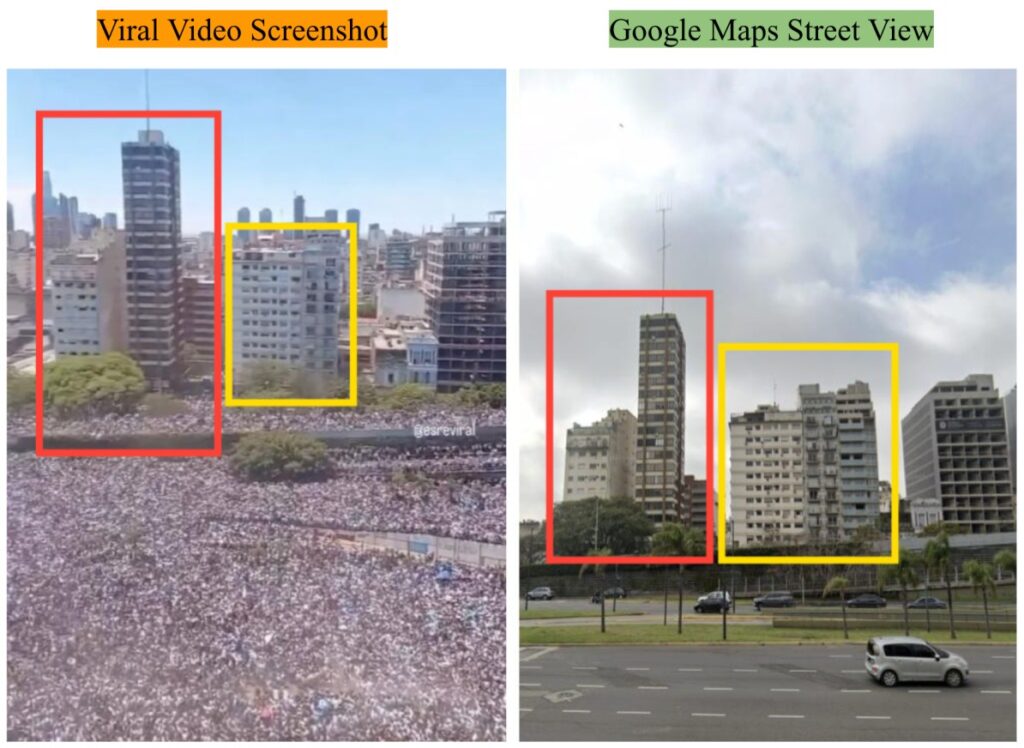 Using Google Street View, we identified the buildings seen in the viral video, confirming that the location is in Buenos Aires, Argentina. The comparison can be seen below.