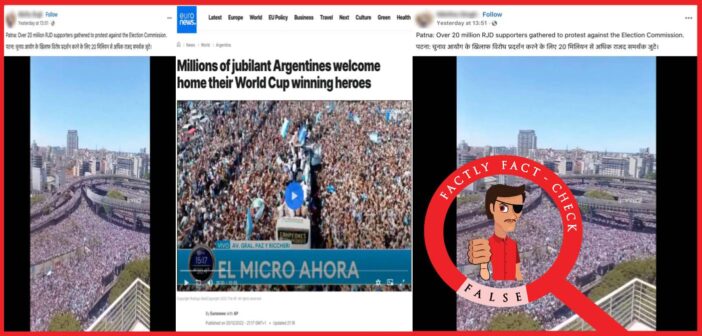 Fact: There are no credible reports of over 20 million RJD supporters gathering in Patna to protest against the Election Commission of India (ECI). The video shows celebrations in Buenos Aires, Argentina, on 20 December 2022, when millions of people gathered to welcome the World Cup–winning national football team. Hence, the claim made in the post is FALSE.