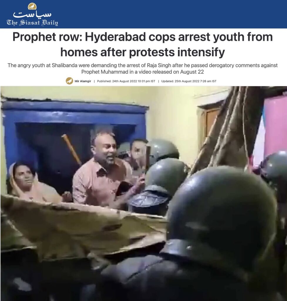 Further research led us to several news reports related to the incident (here and here). According to these reports, in August 2022, BJP MLA T. Raja Singh from Telangana made alleged derogatory remarks about Prophet Muhammad, which led to his arrest and subsequent suspension from the party. Following this, protests erupted in the Shalibanda area of Hyderabad. During these demonstrations, the police dispersed and detained protesters.