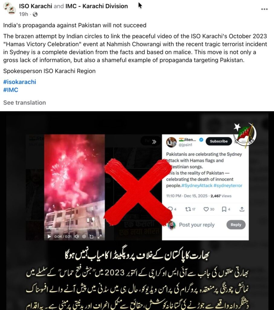 We then conducted a Google search and found the Facebook page of the Imamia Students Organisation. Upon reviewing the page, we found a post debunking the viral video as fake. The post stated that the video of ISO Karachi’s October 2023 “Hamas Victory Celebration” event at Numaish Chowk, being linked to the terrorist incident in Sydney.