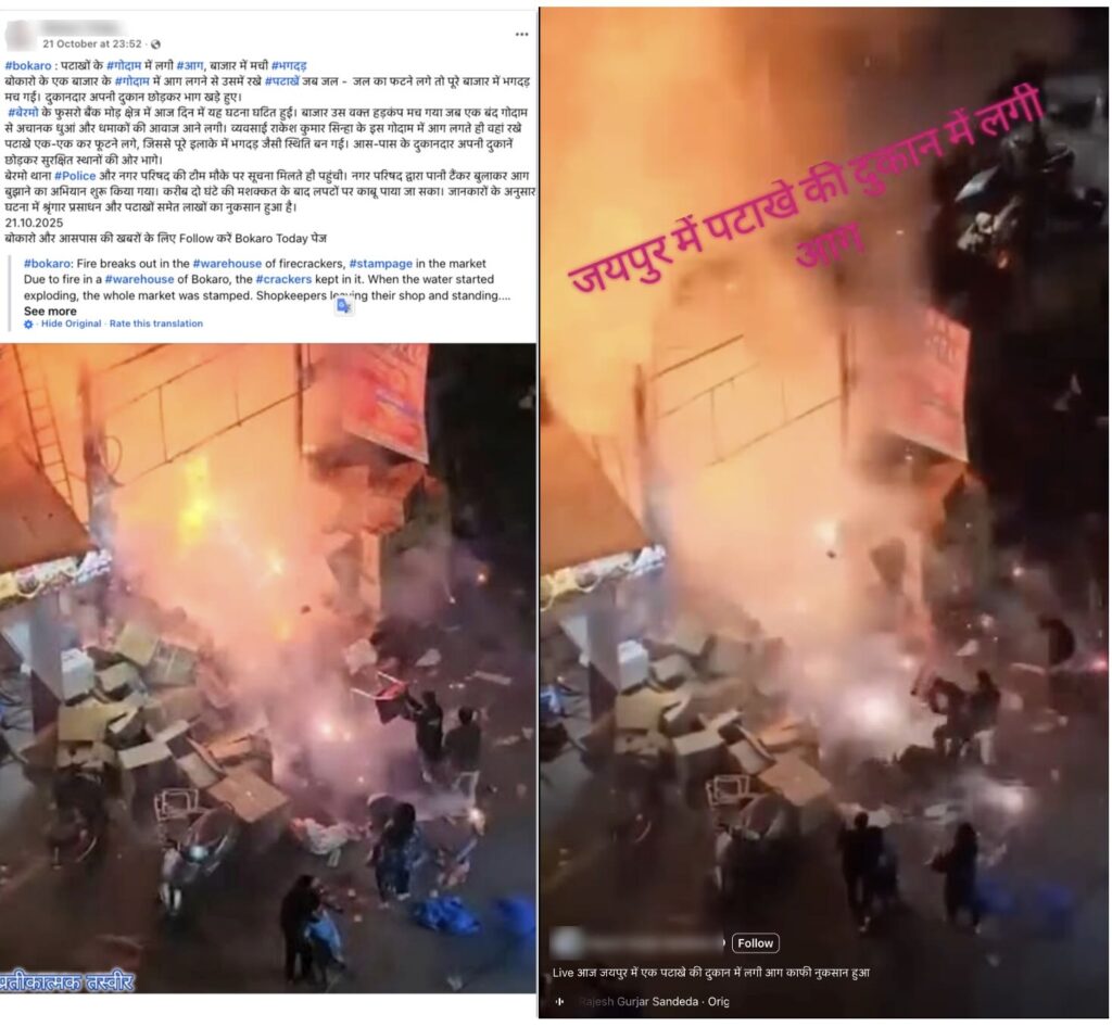 Claim: The visuals show a recent fire at a firecracker shop in Jaipur/Bokaro in October 2025.