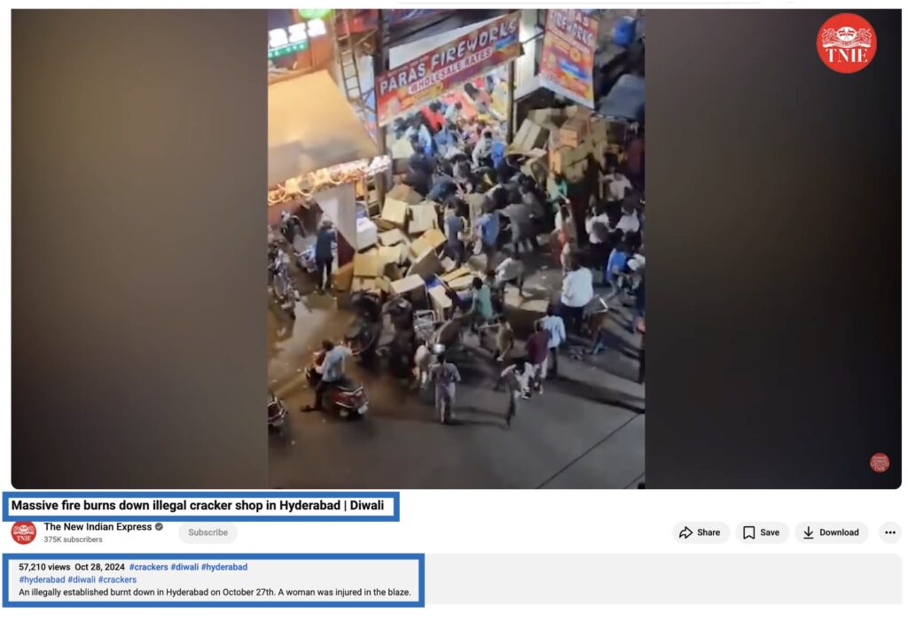 To verify the claim, we conducted a reverse image search on Google, which led us to the same video uploaded by The New Indian Express. The report stated, “Massive fire burns down illegal cracker shop in Hyderabad.” According to the outlet, an illegally established firecracker shop in Hyderabad caught fire on 27 October 2024, injuring a woman in the blaze.