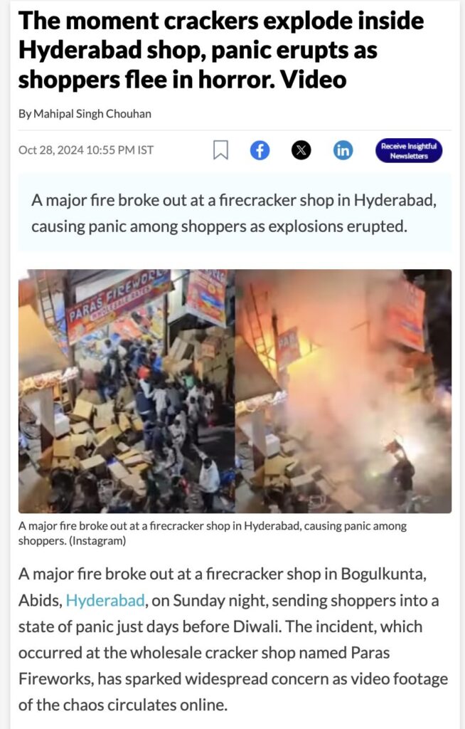 Further research led us to multiple news reports (here, here, here and here) featuring the same viral video and its screenshots. These reports confirm that a massive fire broke out at a fireworks shop in Bogulkunta, Abids area of Hyderabad on 27 October 2024, during the Diwali season. The blaze, reportedly caused by an illegally operated firecracker shop, spread rapidly to nearby vehicles and a restaurant, reducing the shop to ashes. No major casualties were reported apart from a few minor injuries, and firefighters brought the blaze under control soon after.