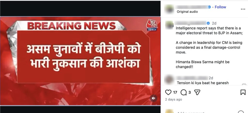 Assam is heading for Assembly elections this year, in 2026, and in this context, a video (here, here and here) from an Aaj Tak news bulletin is circulating on social media claiming that an intelligence report from the state has leaked, predicting a major setback for the BJP. The NDA is currently in power in the state. Let’s find out the truth behind this video.