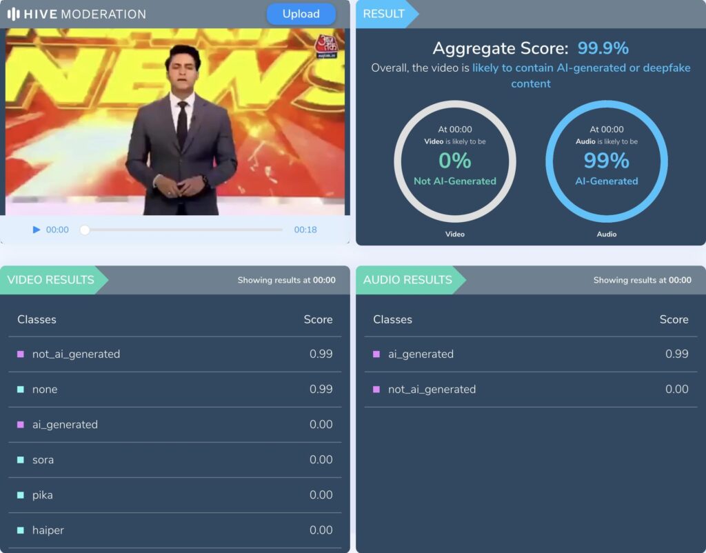To verify the authenticity of the video, we ran it through the Hive AI detector, which flagged it as AI-generated or deepfake. Additionally, the Hiya voice AI detector also confirmed that the audio was a deepfake.