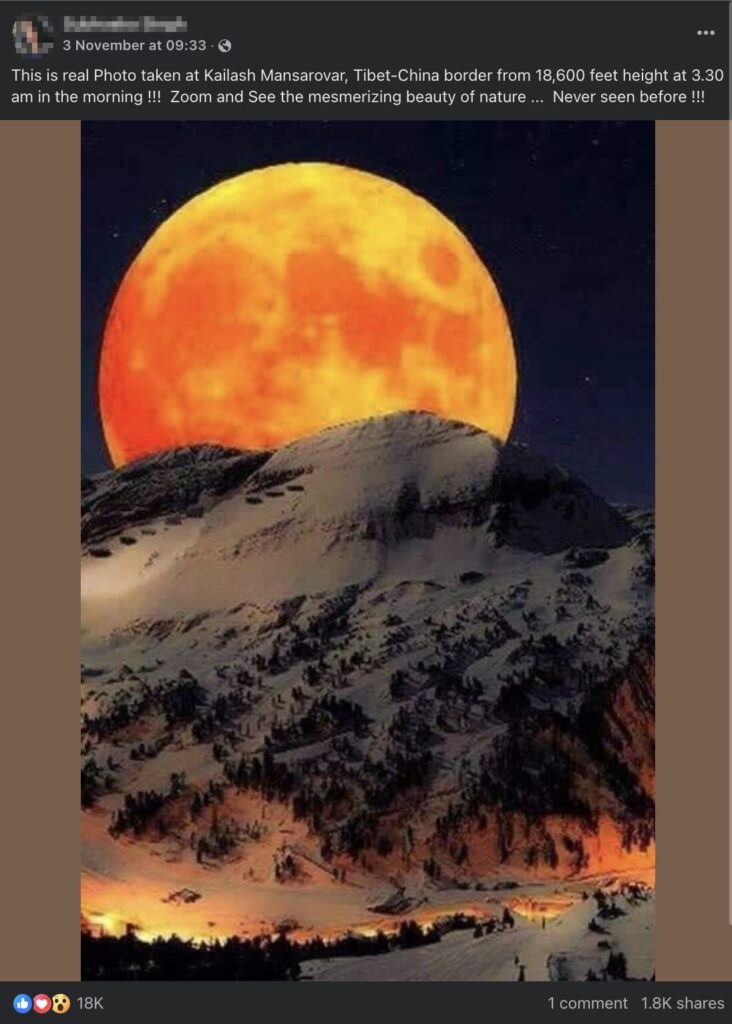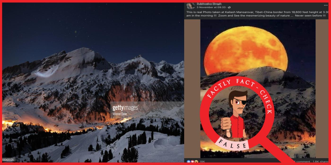 A photo (here, here, and here) of the moon behind a snow-clad mountain is doing the rounds on social media. It is being claimed that this photo was captured at Kailash Manasarovar, a lake located near Mount Kailash, Tibet. We fact-check this claim through this article.