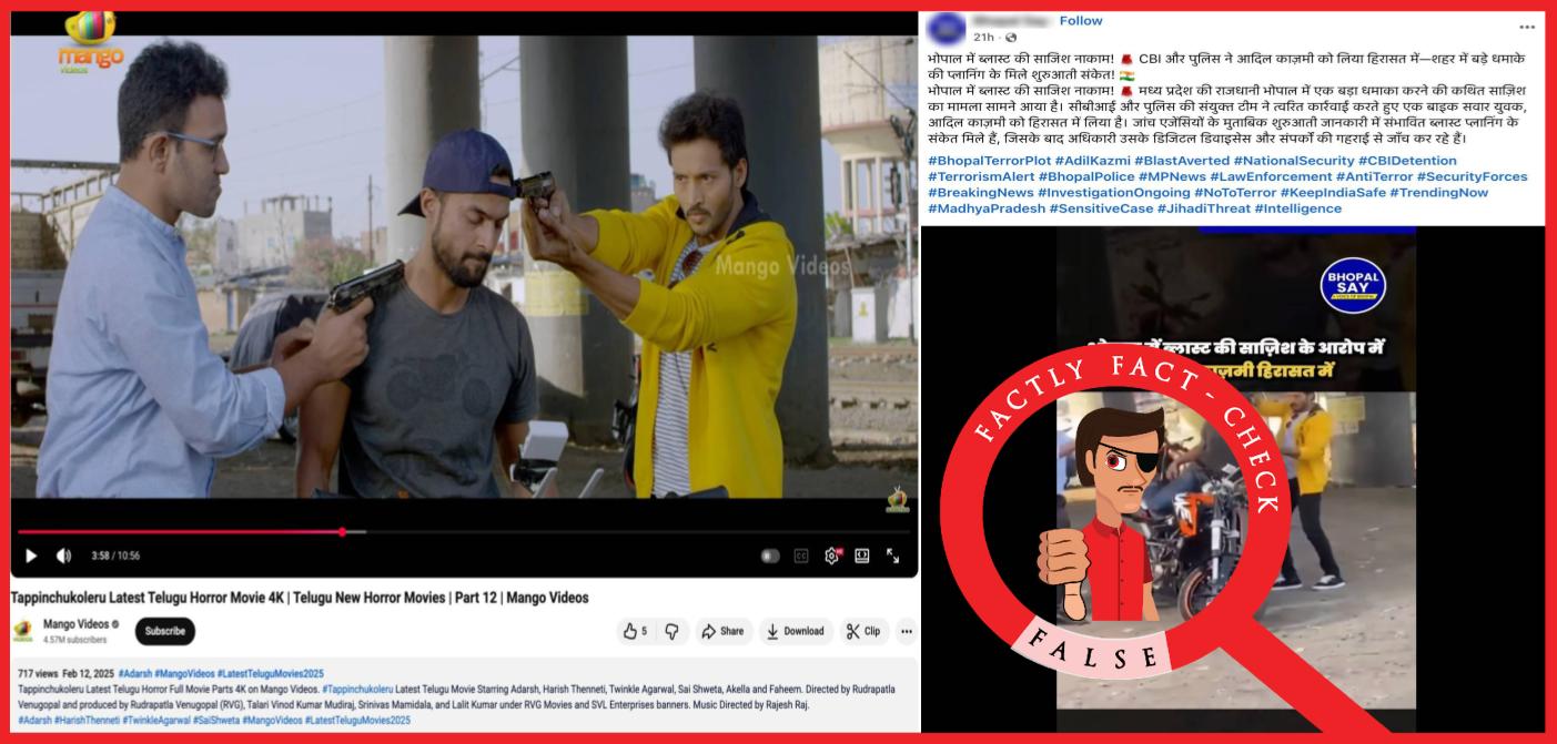 Fact: The video does not show a real arrest by the CBI of a man named Adil Kazmi for planning a bombing. The visuals are from the Telugu film Tappinchukoleru, directed by Rudrapatla Venugopal, in which Syed Adil Kazmi, an actor and professional stunt rider, plays a role. There are no credible recent reports of any individual named Adil Kazmi being arrested by the CBI for planning a bombing in Bhopal. Hence, the claim made in the post is FALSE.