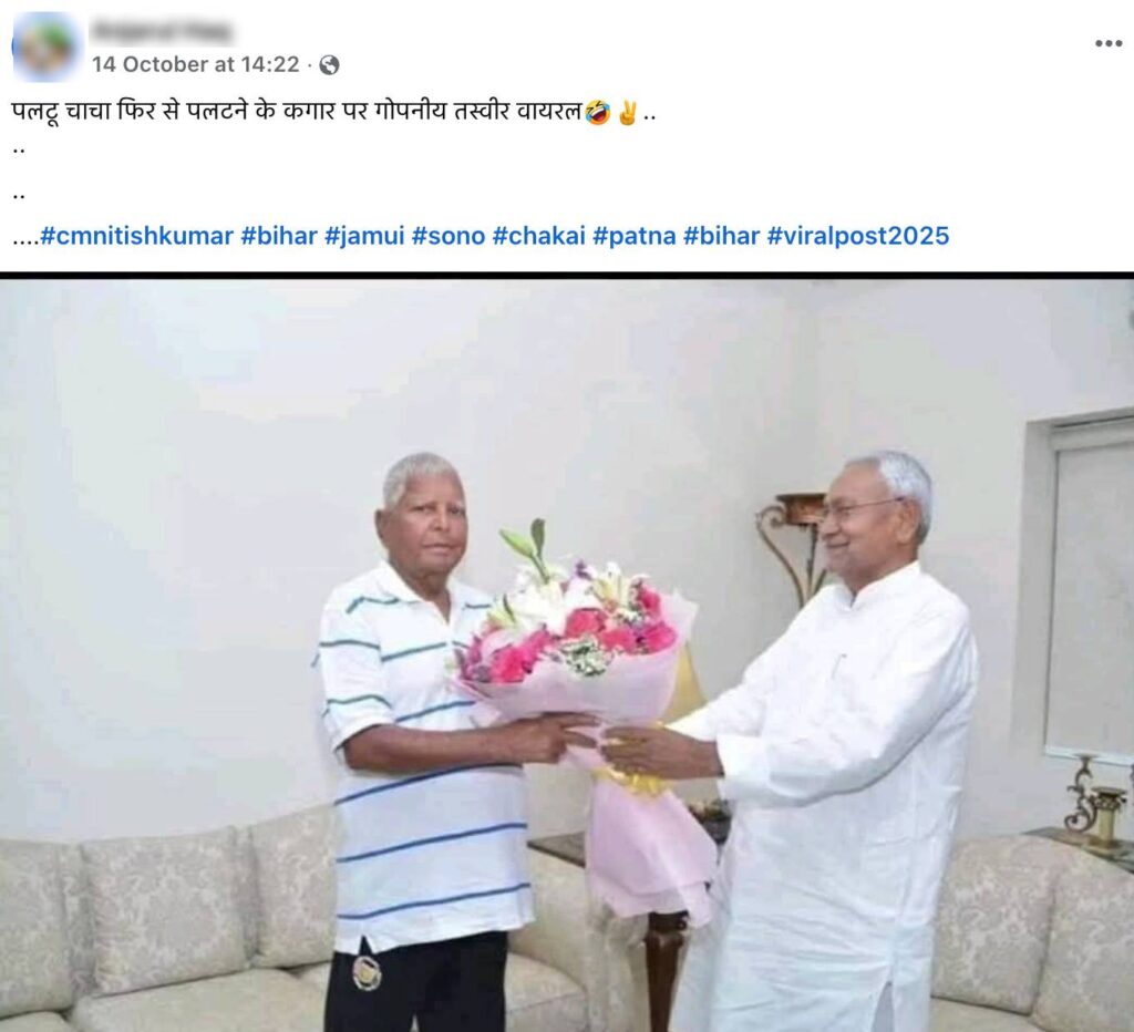 Amid this, a photo of JD(U) leader and Bihar Chief Minister Nitish Kumar with RJD chief Lalu Prasad Yadav is being shared on social media (here, here) with the claim that the photo is recent, from October 2025, and that the two leaders met just ahead of the 2025 Bihar Legislative Assembly elections. Let’s verify the claim made in the post in this article.