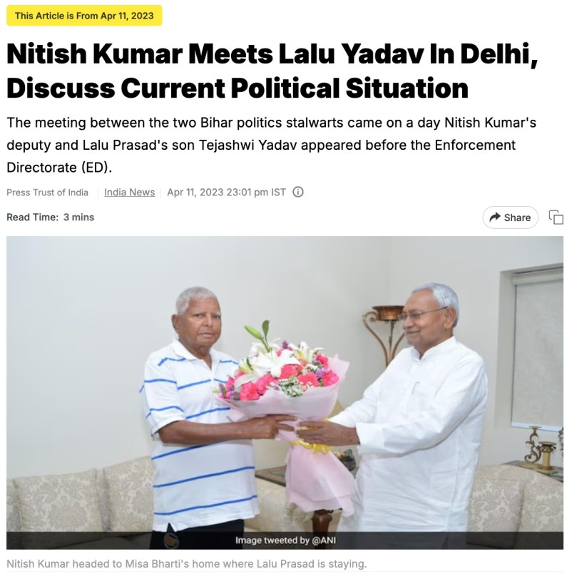 A Google Lens search of the viral photo led us to multiple media reports (here, here, here, and here) from April 2023 featuring the same photo, confirming that the photo is not recent, from October 2025, but predates it by over two years. According to these reports, Bihar Chief Minister Nitish Kumar arrived in Delhi on 11 April 2023 and met RJD supremo Lalu Prasad Yadav to discuss the current political situation and efforts to strengthen Opposition unity.