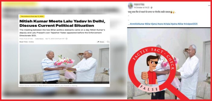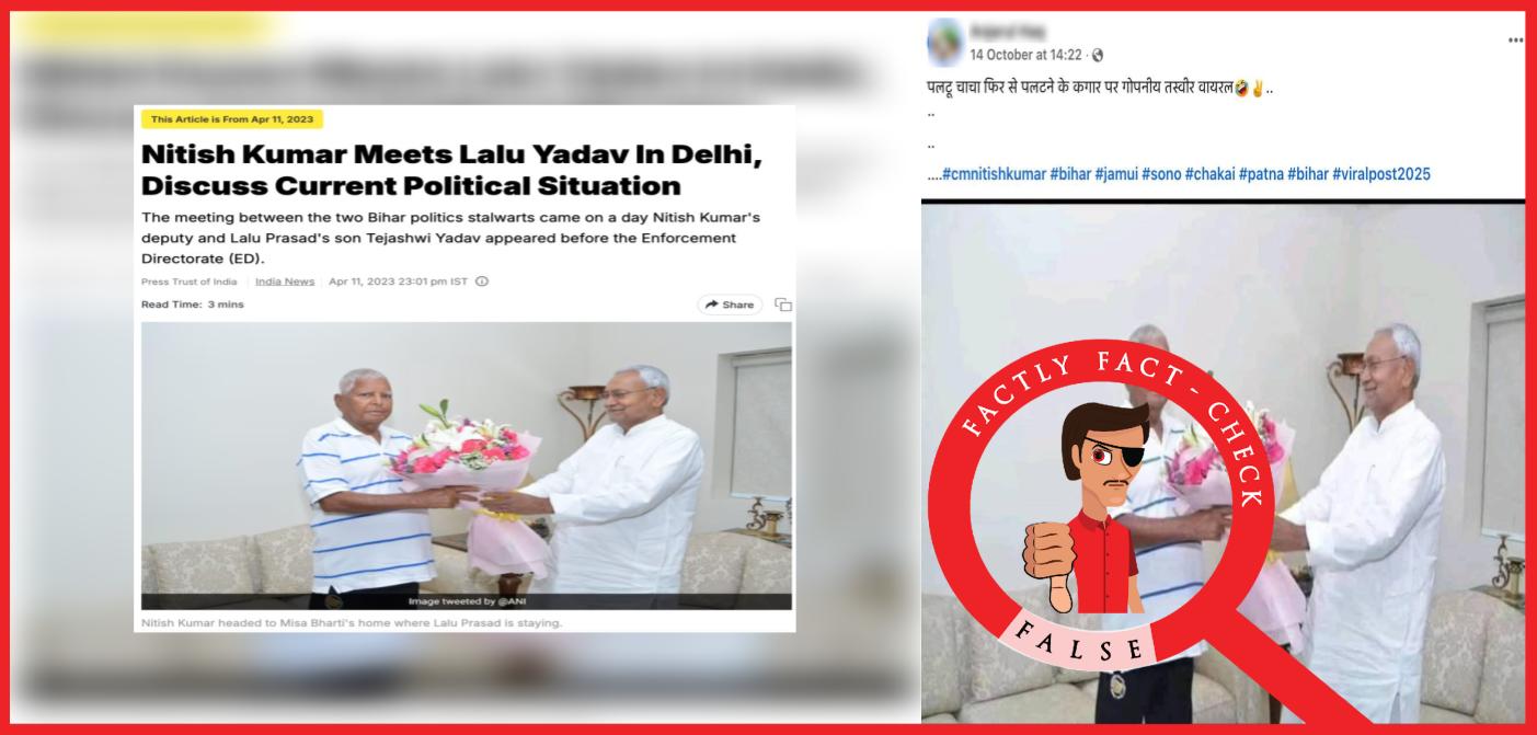 Fact: The photo dates back to April 2023, when CM Nitish Kumar visited Delhi and met RJD chief Lalu Prasad Yadav to discuss the political situation and Opposition unity ahead of the 2024 Lok Sabha elections. Nitish visited Misa Bharti’s residence, enquired about Lalu Prasad’s health, and discussed the political scenario. At the time, Nitish was in alliance with the RJD as part of the Mahagathbandhan, but he switched back to the BJP-led NDA in January 2024 ahead of the Lok Sabha elections. As of 17 October 2025, there are no reports of the two leaders meeting in October 2025. Hence, the claim made in the post is FALSE.