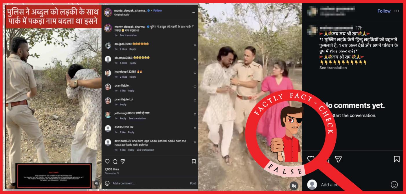 A video on social media apparently shows police officers apprehending a Muslim man named Irfan posing as a Hindu man named Ravi to trap a Hindu girl. We will fact-check this claim through this article.
