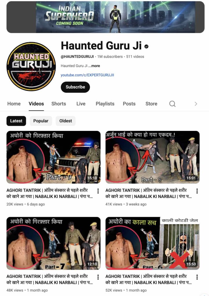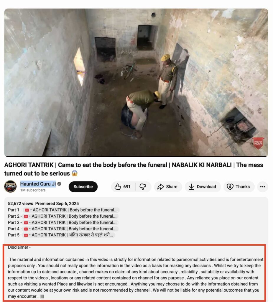 To learn more about the viral video, we conducted a Google reverse image search using keyframes from the clip. This search led us to a full-length video uploaded to a YouTube channel named ‘Haunted Guru Ji’ on 06 September 2025, titled “AGHORI TANTRIK | Came to eat the body before the funeral | NABALIK KI NARBALI | The mess turned out to be serious” (translated from Hindi to English).