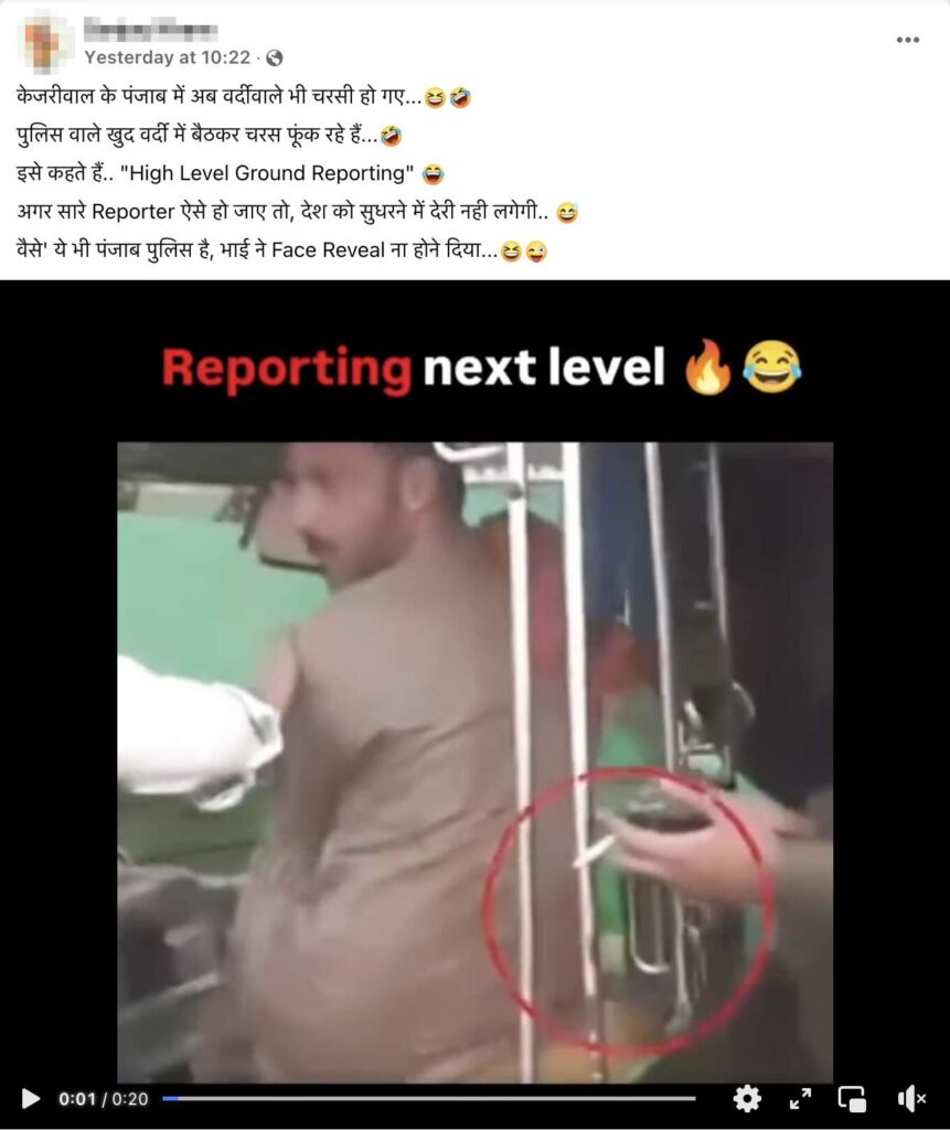 A viral video (here, here, and here) on social media allegedly shows a police officer in Punjab running away from a news reporter after he was caught smoking weed in an auto-rickshaw. Applauding the reporter’s efforts, social media users are sharing this video claiming that in Kejriwal’s Punjab, even police officers have become drug addicts. We fact-check this claim through this article.