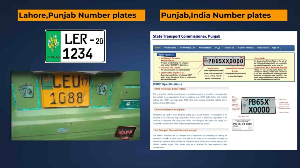 This makes it clear that the number plate does not belong to a vehicle registered in Punjab, India. You can find a few Punjab (Pakistan) vehicle registration plates here and here. One of them, posted by a user on ‘pakwheels.com,’ is a number plate from Lahore (code-LEI). You can see the difference between the two in the following collage.