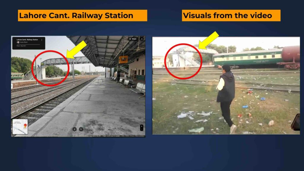 Additionally, the reporter seen in the video, Nadeem Abbas mentions that the officer was running towards Cant. We can see him running towards a railway station. We then searched for Cant railway station in Pakistan, Punjab, and found that he was referring to the Lahore Cantonment railway station. A few photos (here and here) uploaded by users on Google Maps have similarities with the visuals observed in the viral video.