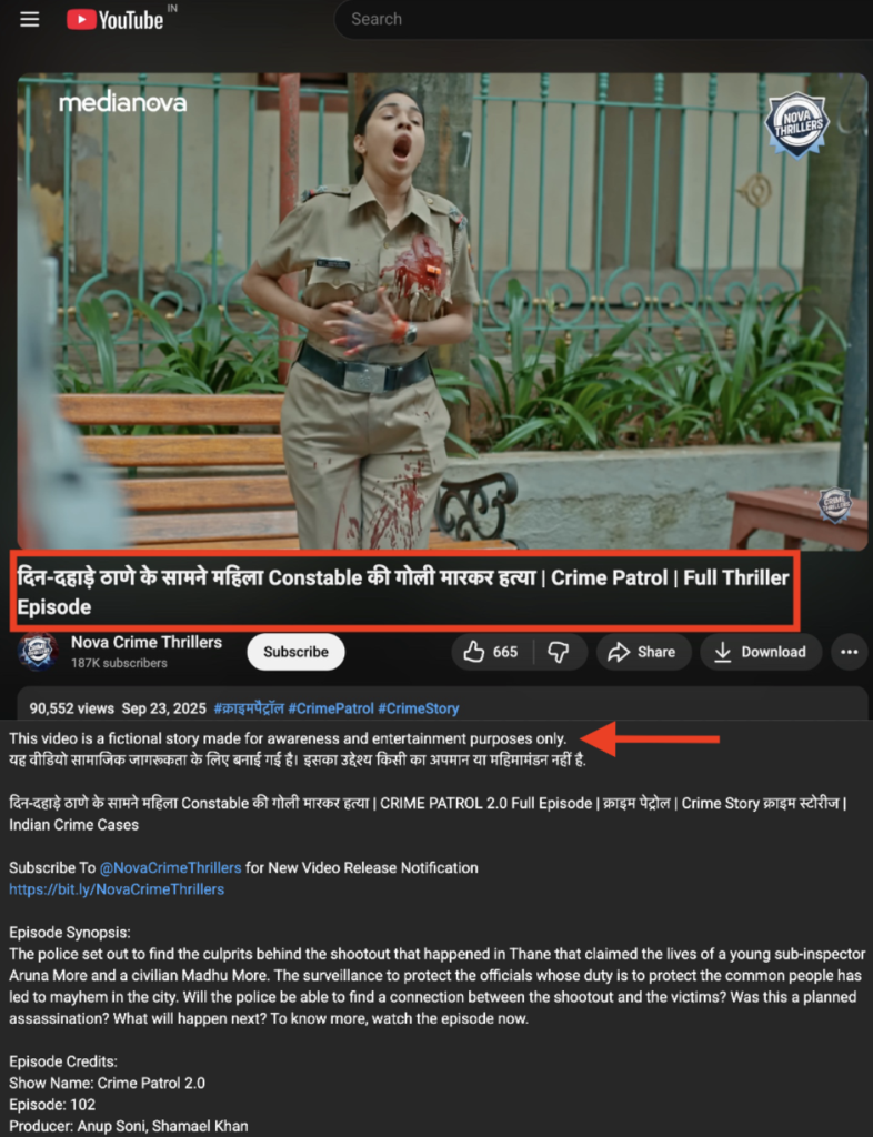 To identify the movie or series from which the viral video originated, we performed a relevant keyword search. This led us to the crime web series Crime Patrol 2.0, uploaded on the YouTube channel Nova Crime Thrillers on 23 September 2025. The thumbnail of the episode itself shows the woman being shot, matching the viral clip. At the timestamp 04:07, the same scene from the viral video can be seen. The video description clearly mentions that it is a completely fictional story created for entertainment purposes only.