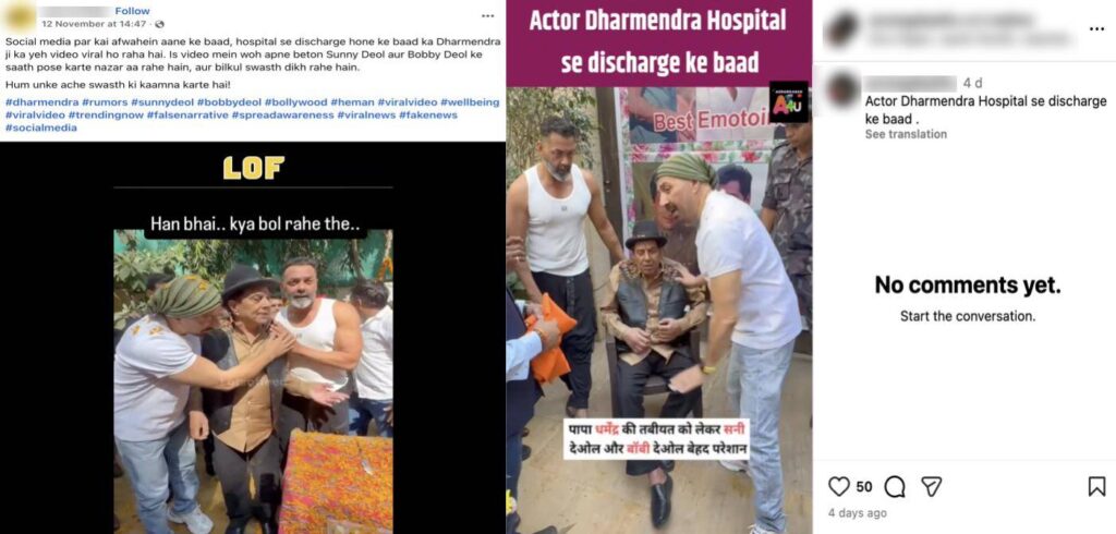 In this context, a couple of videos (here, here, and here) are circulating on social media claiming to show Dharmendra arriving home after his discharge, with posts asserting that the clip shows him with his sons Sunny Deol and Bobby Deol in November 2025. Let’s verify the claim made in the post in this article.
