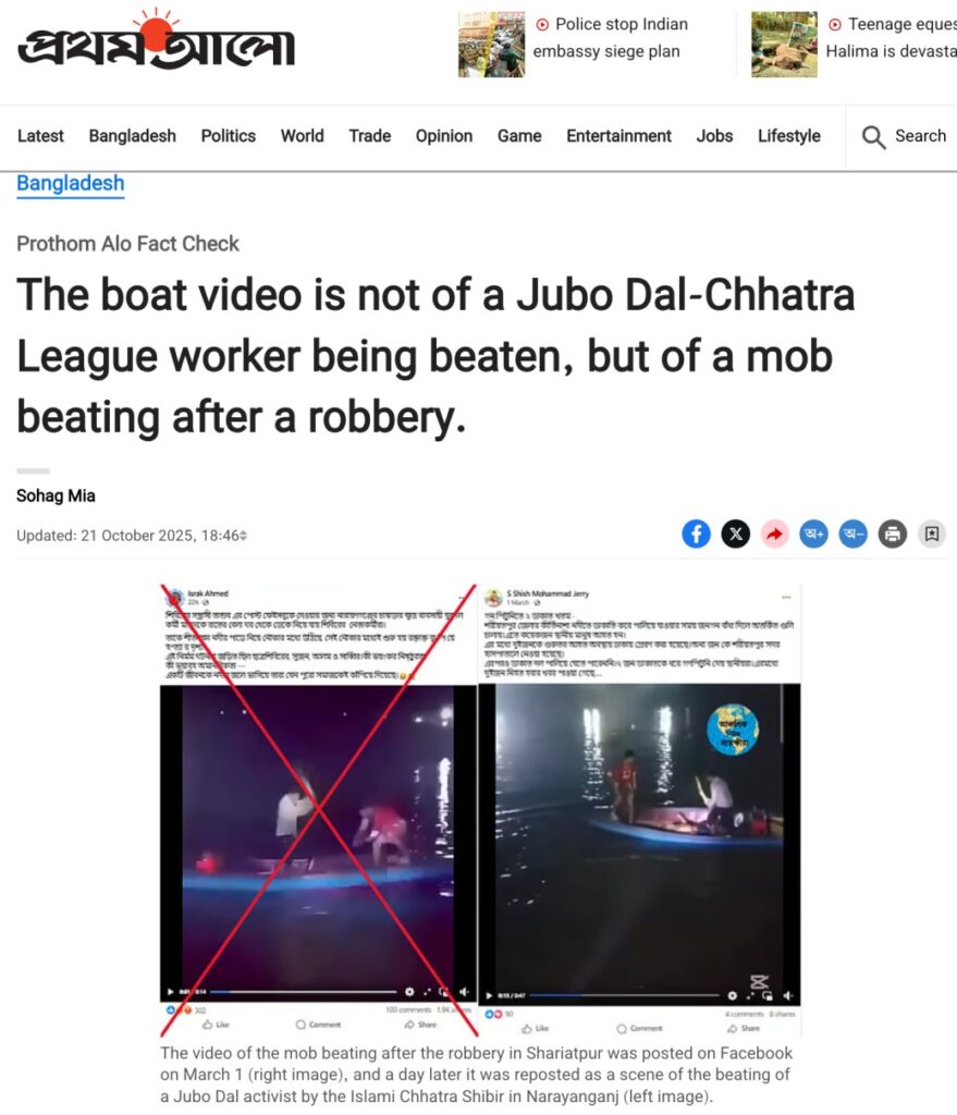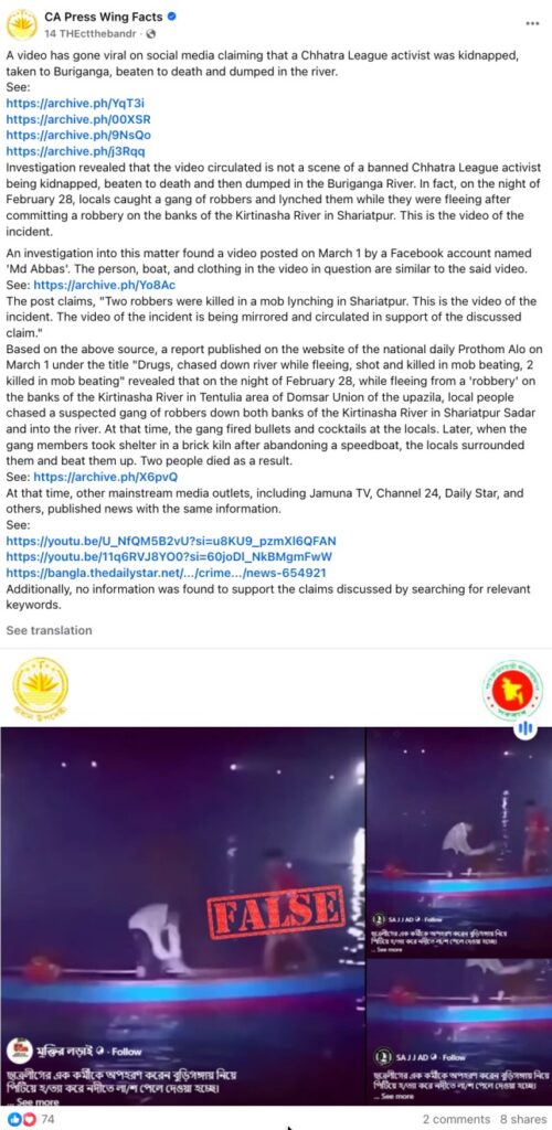 After the incident, when the same video went viral with the false claim that a Student League worker was kidnapped and beaten to death in the Buriganga, the Chief Adviser’s Press Wing of the Bangladesh government clarified that the claim was false, confirming that the video is from Bangladesh and not India.
