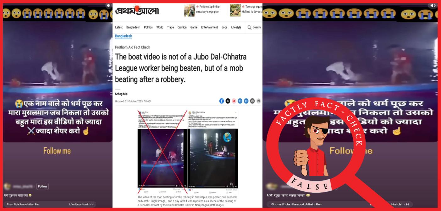 Fact: The video does not show an incident in India. Bangladeshi media reports confirm that it actually depicts a mob attack on alleged robbers near the Kirtinasha River in Shariatpur, Bangladesh, on the night of 28 February 2025. During the incident, a gang attempting a robbery fled by speedboat, opened fire, and hurled hand bombs at locals. Residents blocked their escape, captured gang members, and beat them before police and army personnel intervened. Hence, the claim made in the post is FALSE.