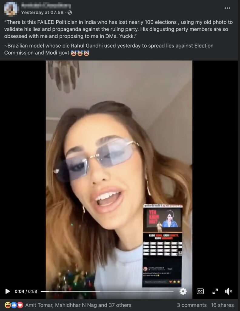 Claim: This video shows the Brazilian model, whose photograph was allegedly registered in the 2024 Haryana elections voter list 22 times, according to Rahul Gandhi, calling him a failed politician who has lost 100 elections and is using her photograph for propaganda. In the video, she accused Congress party workers of harassing her on her DM’s.