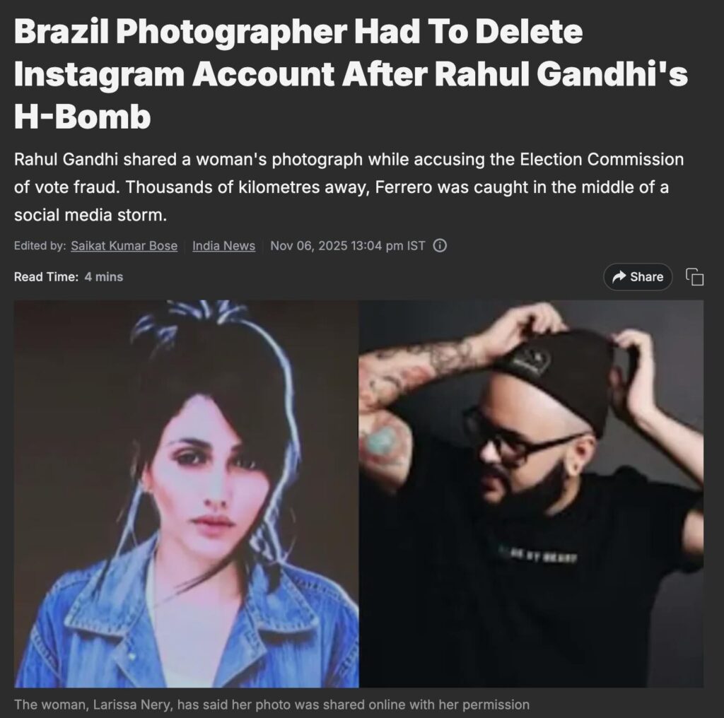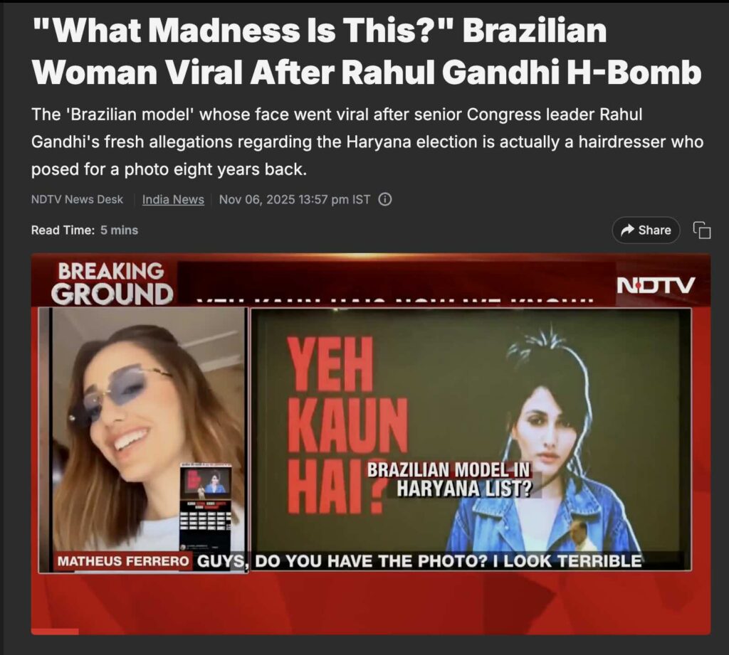 To verify the claim, we searched the internet using relevant keywords to determine whether the Brazilian model featured in Rahul Gandhi’s 5 November 2025 ‘vote chori’ press conference had made any comments about him. Through this search, we found multiple media reports (here, here, here, here, and here) that featured screenshots from the viral video.