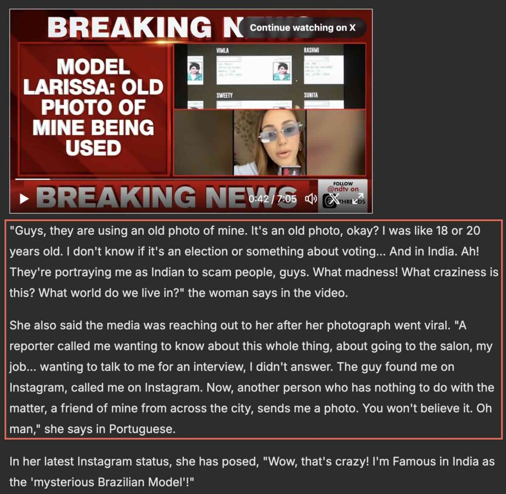 To sum up, a video of Brazilian hairdresser Larissa expressing shock over her old photograph being misused in the Indian elections is shared with misleading claims.