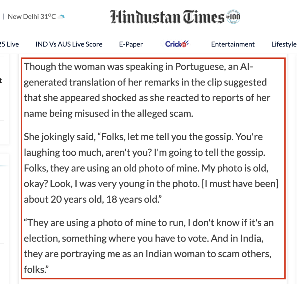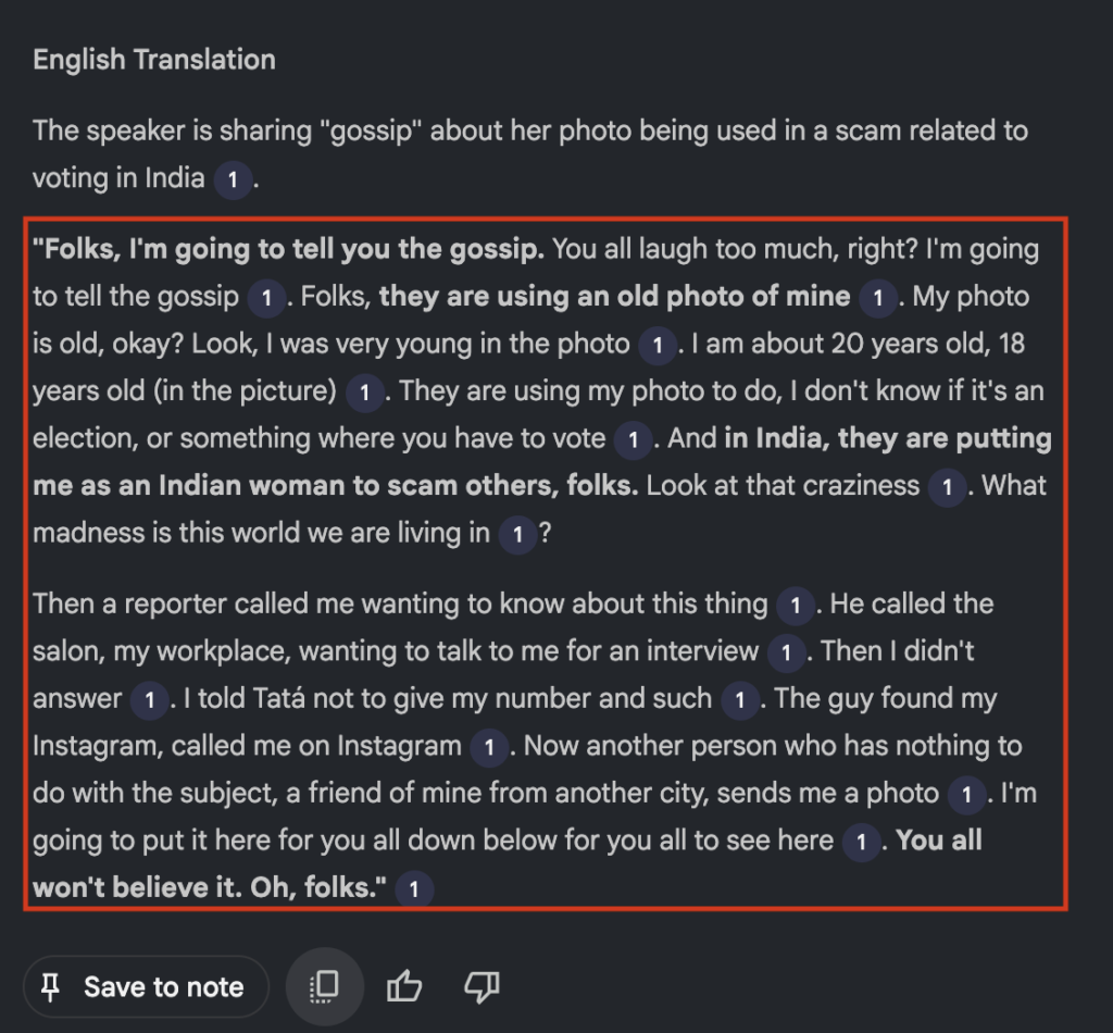 To verify what she said in Portuguese in the viral video, we ran the video through Google’s NotebookLM and found the transcription for her Portuguese speech. It matched what was reported in the media.