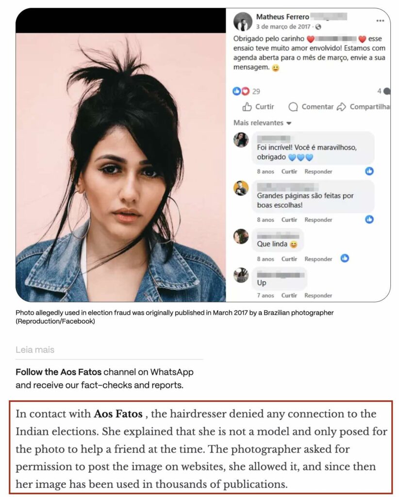 Further, we found a report published on this issue by ‘Aos Fatos,’ a Brazilian fact-checking organisation. Speaking to them, she denied having any kind of connection to the Indian elections.‘She explained that she is not a model and only posed for the photo to help a friend at the time. The photographer asked for permission to post the image on websites, she allowed it, and since then her image has been used in thousands of publications,’ reported Aos Fatos.