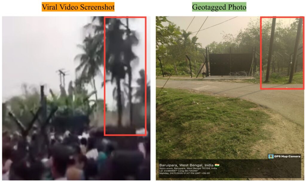 To verify the viral video, we contacted the Murutia police station in charge, SI Nirmalya Dutta. He confirmed it was shot at Funkatala and that the people were heading to Nimtala Ghat on the Mathabhanga River for the Kali idol immersion. He added that the border fencing and gate seen in the video were built earlier this year and that large crowds gather here every year for the immersion, though this year’s crowd was slightly smaller due to the new gate and fencing.