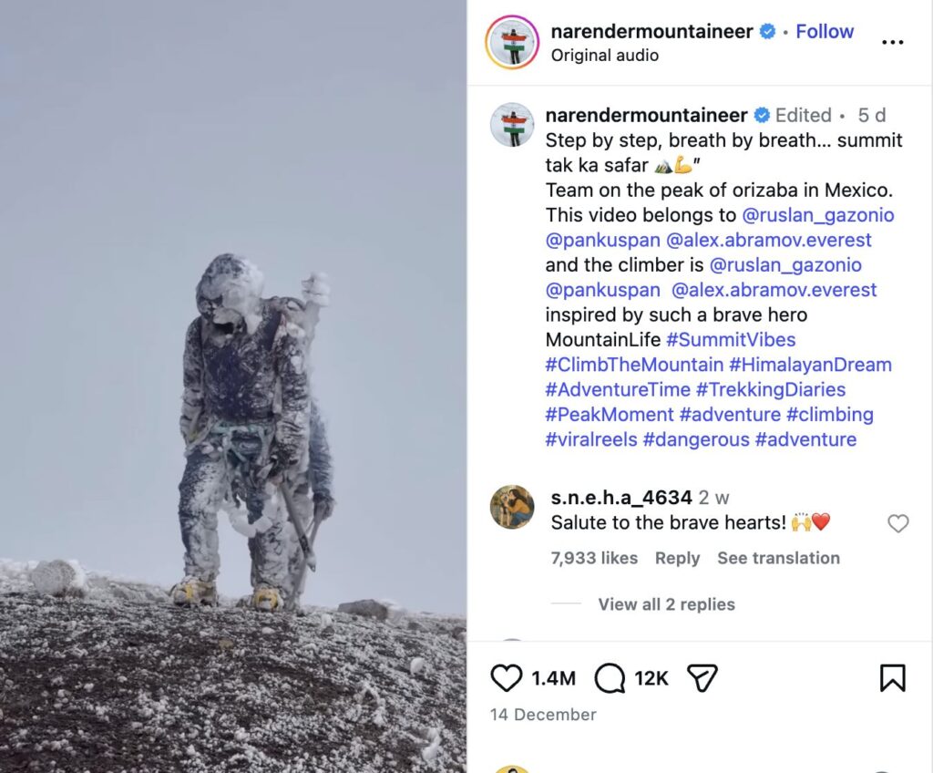 To verify the claim, we performed a reverse image search using keyframes from the viral video. This led us to the same video uploaded on 14 December 2025 by Indian mountaineer Narendra Kumar on his Instagram handle. In the post’s description, he stated that the video was recorded during his climb of Orizaba Peak in Mexico along with his team (@ruslan_gazonio, @pankuspan, and @alex.abramov.everest).