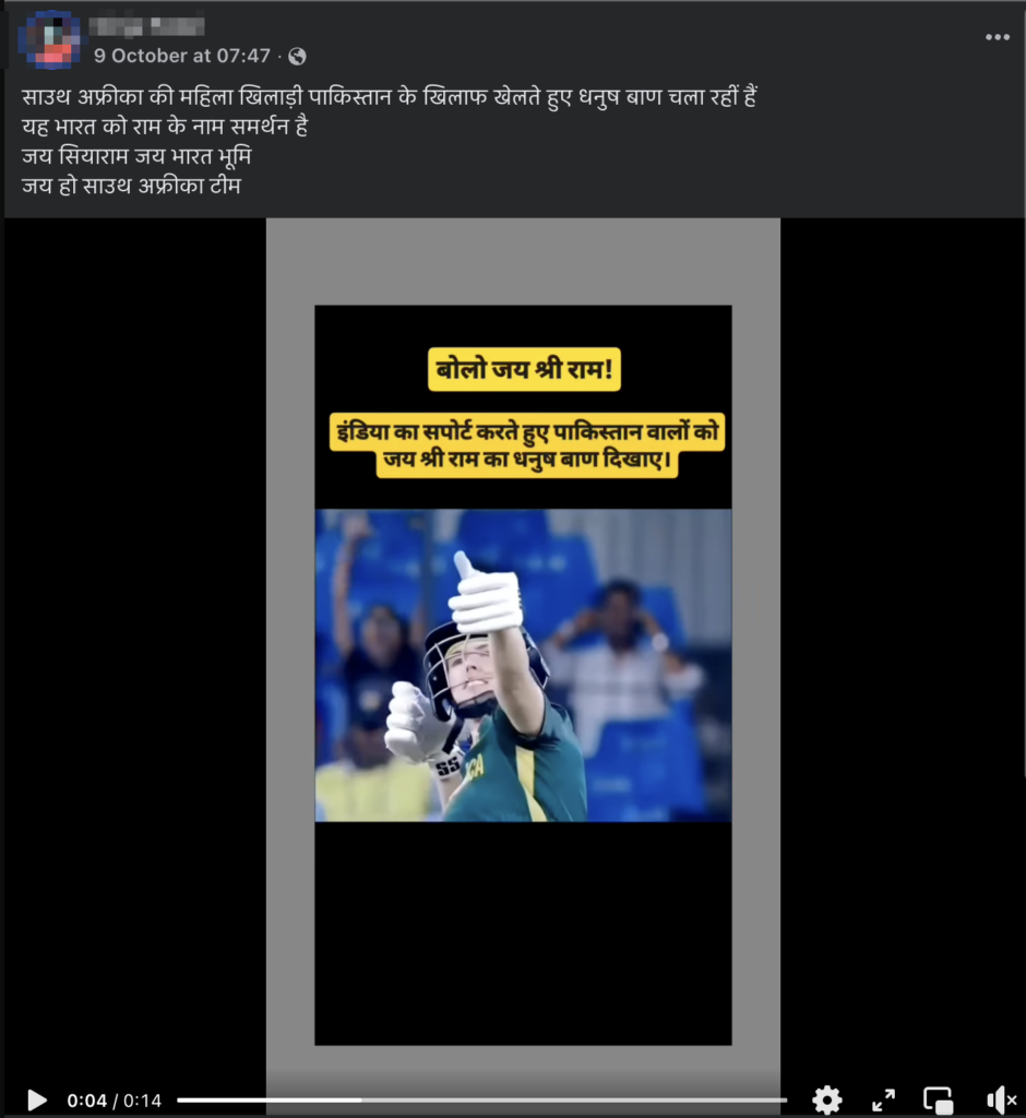 Claim: South African cricketer Tazmin Brits is seen in this video shooting a bow in the air, in imitation of Lord Rama during a cricket match against Pakistan, in support of India.