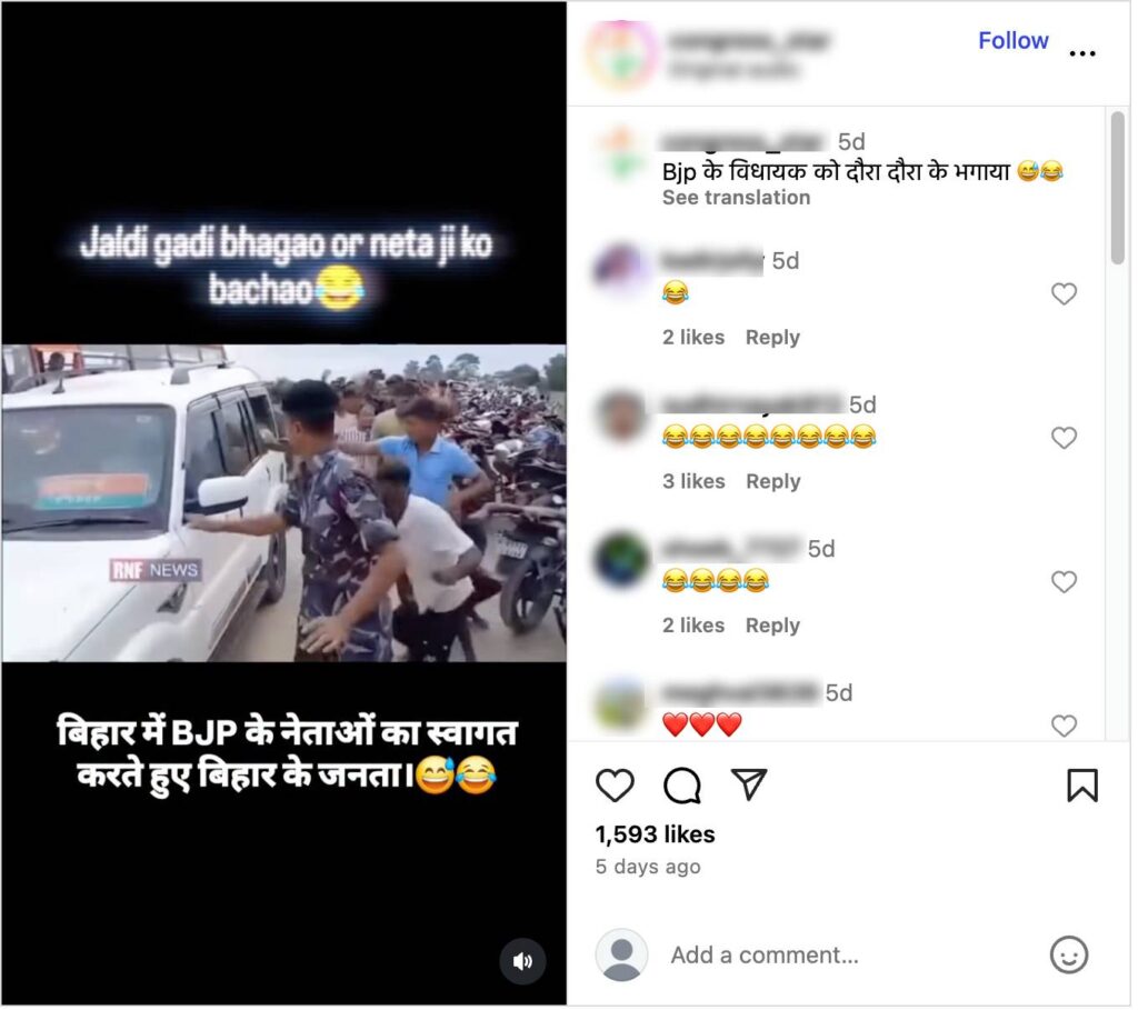 Amid this, a video showing people attacking a car in a convoy with shoes, slippers, and stones, while a uniformed security officer tries to escort the vehicle safely, is being shared with the claim that it depicts a recent incident in Bihar, where people attacked a BJP MLA (here, here, here, here, and here). This article fact-checks the claim made in the post.