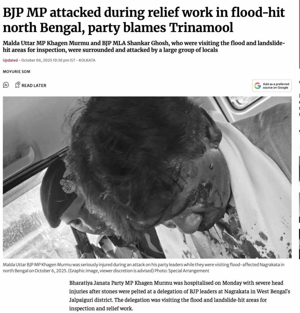 A keyword search further led us to multiple news articles (here, here, here, and here). According to these reports, Malda Uttar MP Khagen Murmu and Siliguri BJP MLA Shankar Ghosh, who were inspecting flood- and landslide-affected areas, were surrounded and attacked by a large group of locals in Nagrakata, Jalpaiguri district, West Bengal, on 06 October 2025. Both leaders sustained injuries and were rushed to a local hospital.