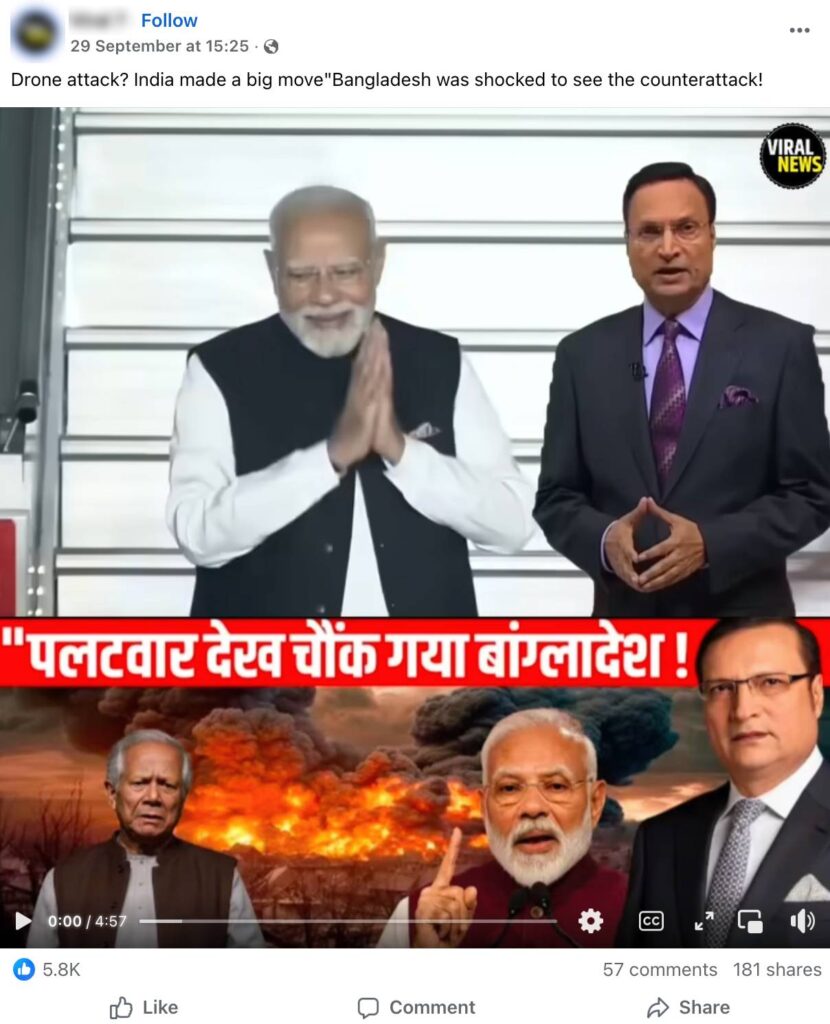 Claim: The video shows Rajat Sharma reporting on a potential India-Bangladesh war, citing border incidents, drone activity, and political developments.