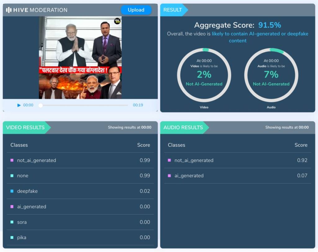 We noticed that the lip sync in the viral video does not match the audio. We then ran the video through the Hive AI detection tool, which confirmed that it contains AI-generated or deepfake content. Hive flagged it with an aggregate score of 91.5% AI-generated, confirming the video is fake.