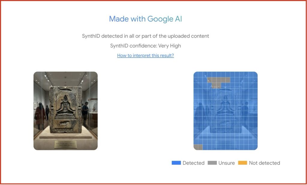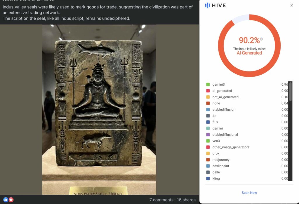 Then, to learn more about the viral photo, we ran a reverse image search. However, we did not find this photo on any official Indian Government website or in media reports claiming to be a Proto-Shiva motif from the Indus Valley Civilisation era. Suspecting that it was an AI-generated image, we ran the image through AI content detection tools, such as Google’s Synth ID detector and Hive. Both the tools identified it as an AI-generated image.