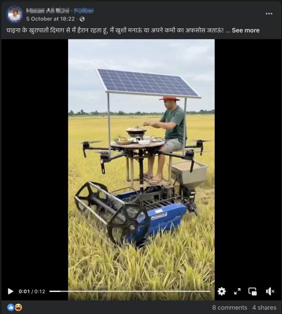 A video (here, here, and here) is being shared online, showing a machine that cuts paddy, auto-unloads the harvested crop, and even shows a person cooking food on it. It is being claimed that it’s a Chinese invention capable of all these tasks. We will fact-check this claim through this article.