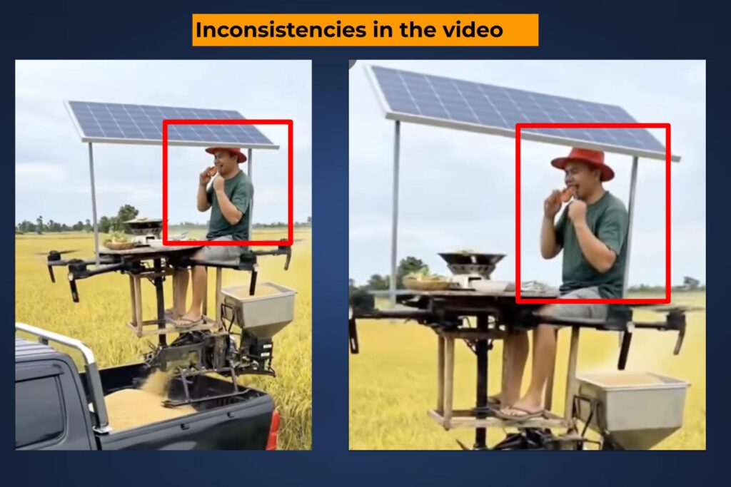 Additionally, we observed that at certain points in the video, the rod located on the upper part of the machine appears to be almost penetrating the person sitting on it. Such discrepancies are common in AI-generated content.