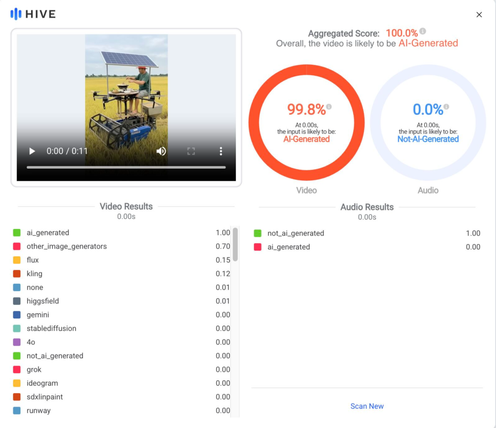 To check whether the video was generated using Artificial Intelligence tools, we ran the video through Hive, an AI content detection tool, which flagged the video as 99.8% likely to be generated by AI.