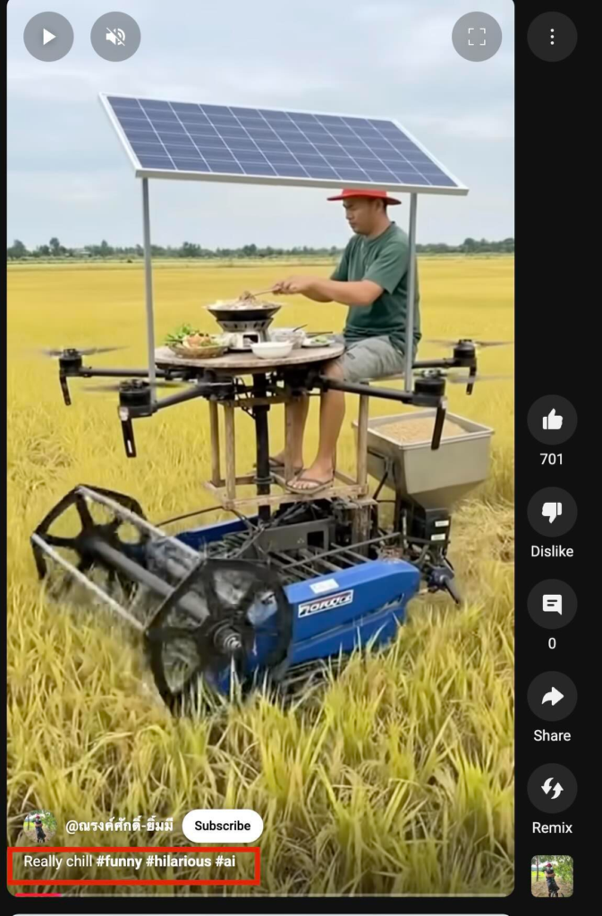 Fact: The video is AI-generated and does not show a real machine. It was posted by a Thai content creator and has no basis in actual agricultural technology. Hence, the claim made in the post is False.