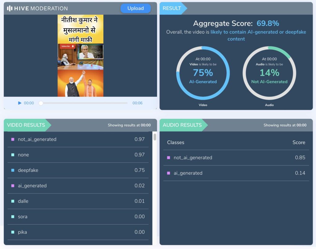 We then observed that the voice of Nitish Kumar in the viral video seemed odd and robotic. This made us suspect that the video could have been made using Artificial Intelligence. To verify the same, we ran the video through AI-content detection tools like Hive and Deepfake-o-meter, which identified the video as AI-generated (here and here).