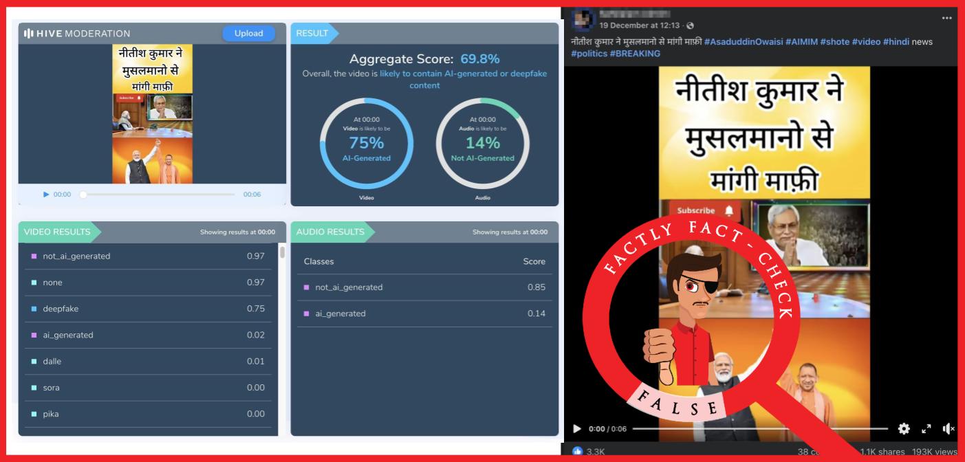 Fact: This is an AI-generated deepfake video, not a real video of Nitish Kumar apologizing to Indian Muslims. AI content detection tools have identified it as an AI-generated video. Hence, the claim made in the post is False.